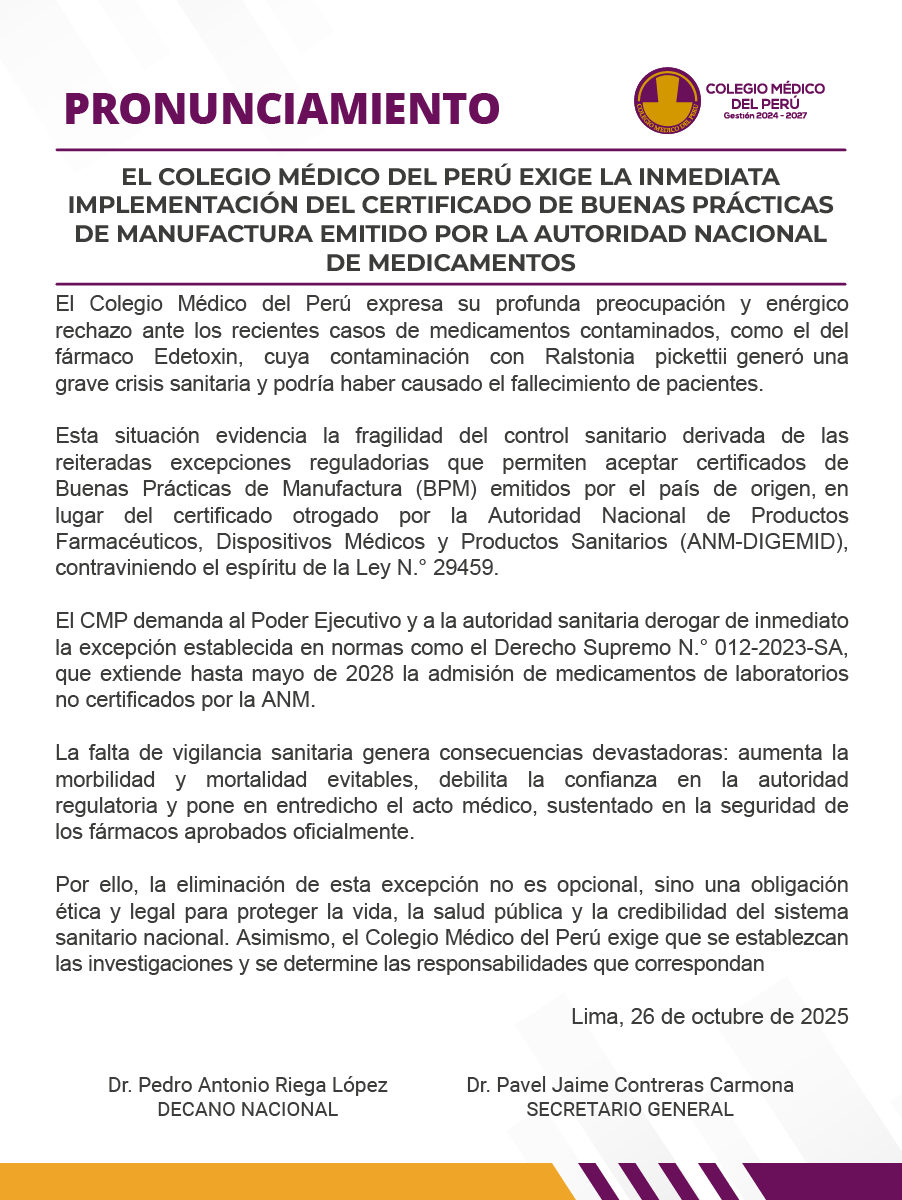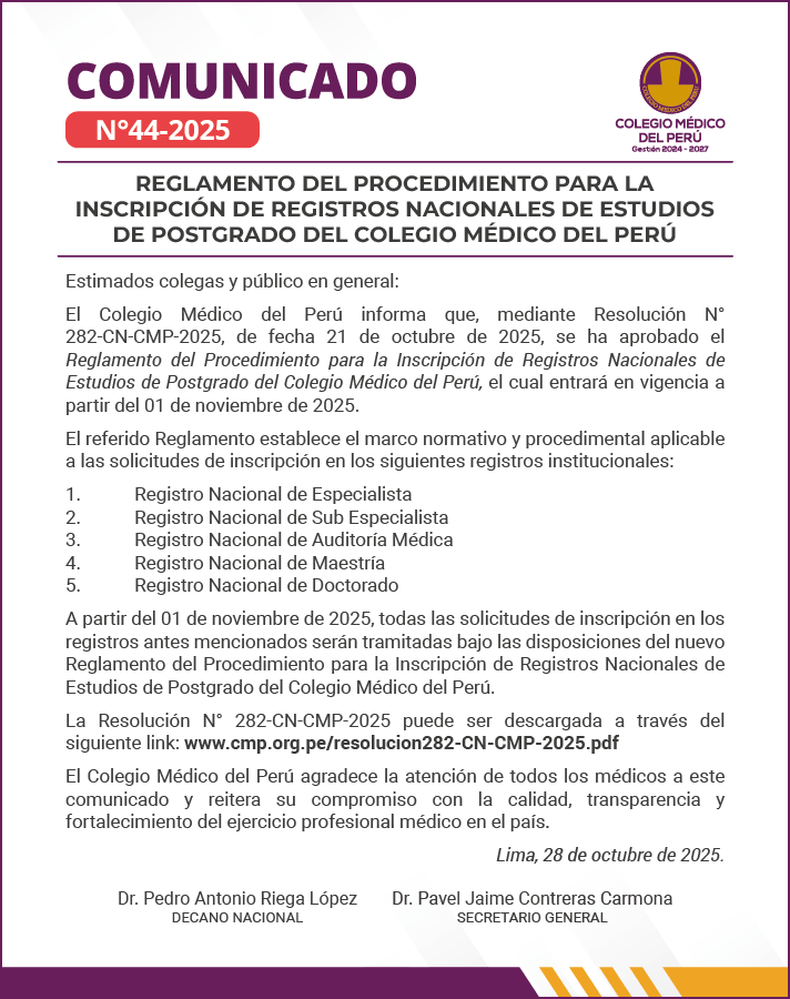 - COMUNICADO N° 38/2025: EL COLEGIO MÉDICO DEL PERÚ IMPULSA LA REFORMA DEL SERUMS Y LA EXCELENCIA EN LA EDUCACIÓN MÉDICA