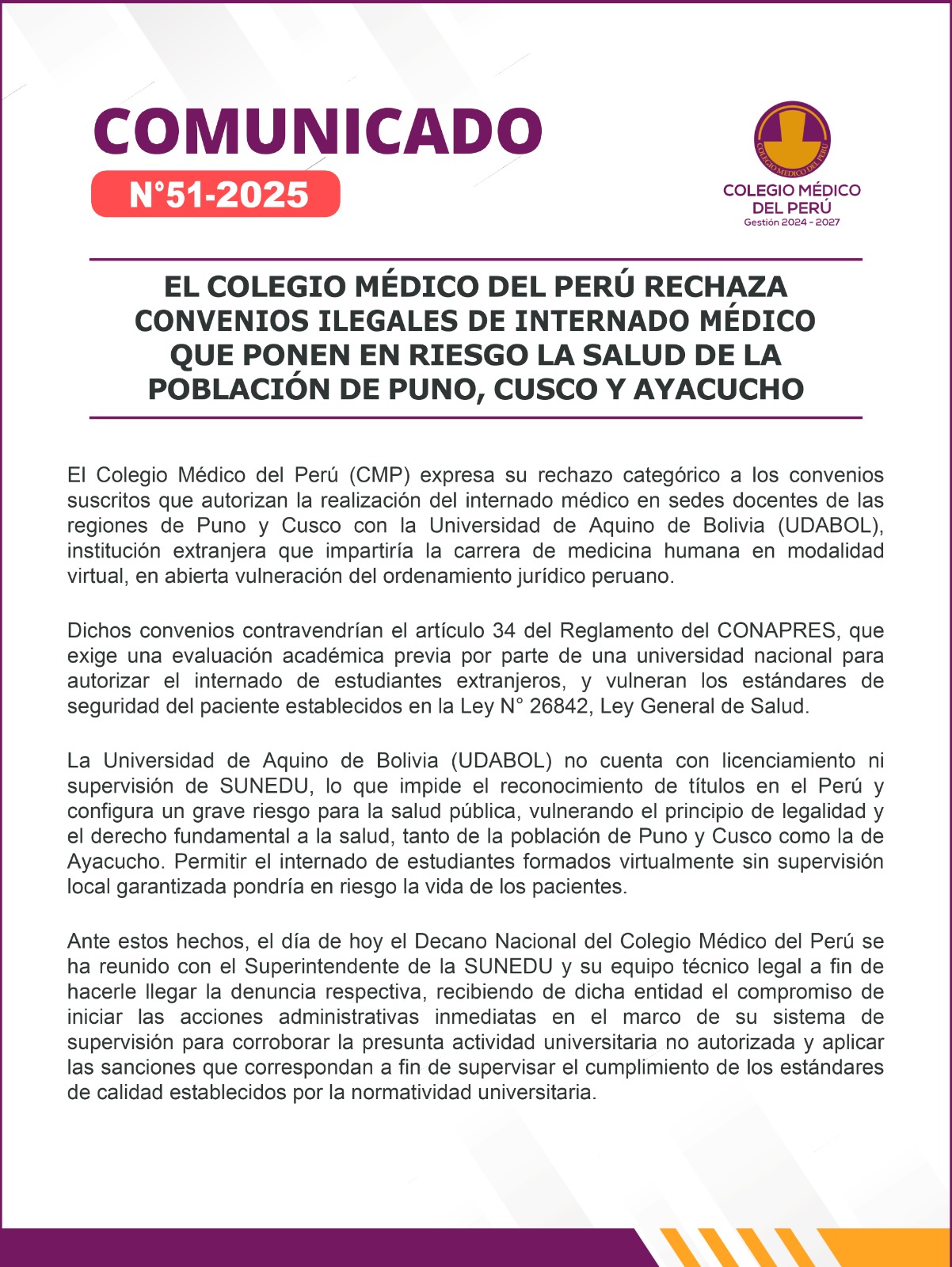 - COMUNICADO N° 10/2024 – EL COLEGIO MÉDICO DEL PERÚ RECHAZA LA CREACIÓN DE LA CARRERA PROFESIONAL DE MEDICINA ALTERNATIVA DE LA RECIENTEMENTE CONSTITUIDA UNIVERSIDAD NACIONAL FRONTERIZA AUTÓNOMA DE YUNGUYO (LEY N° 32090), AL CONSIDERARLA INCONSTITUCIONAL