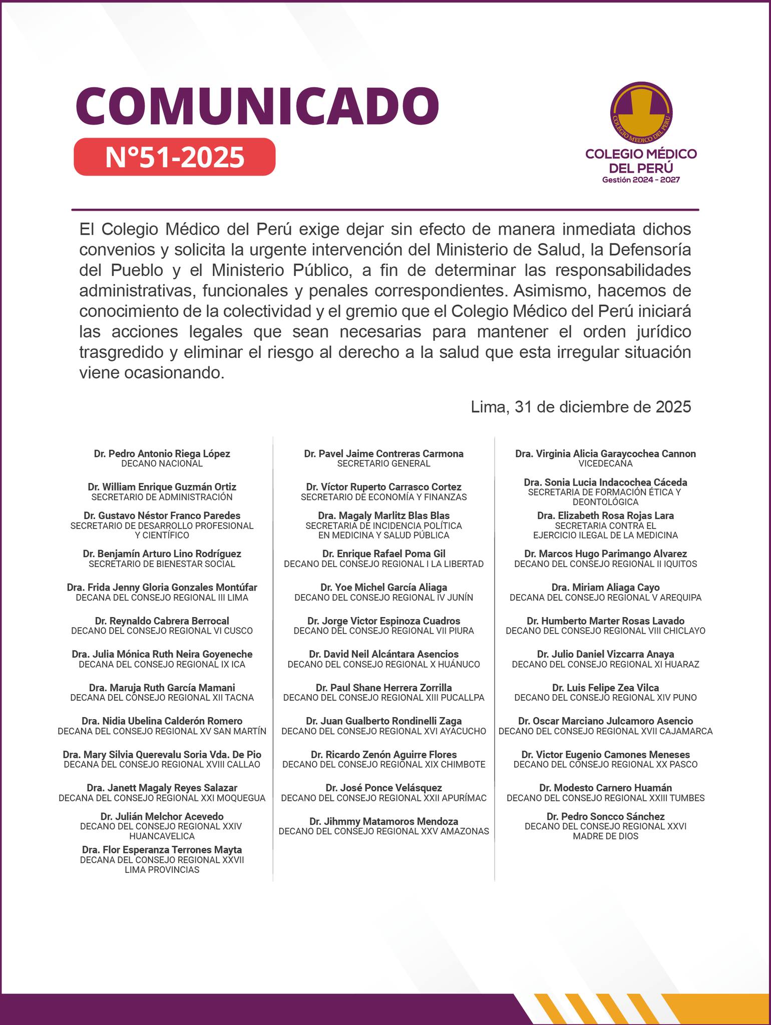 - COMUNICADO N° 27/2025 – EL COLEGIO MÉDICO DEL PERÚ Y LA FEDERECIÓN MÉDICA PERUANA EXPRESAN LA FIRME Y URGENTE NECESIDAD DE QUE EL PLENO DEL CONGRESO DE LA REPÚBLICA ESTE JUEVES 20 DE MARZO DEROGUE LA LEY 32210
