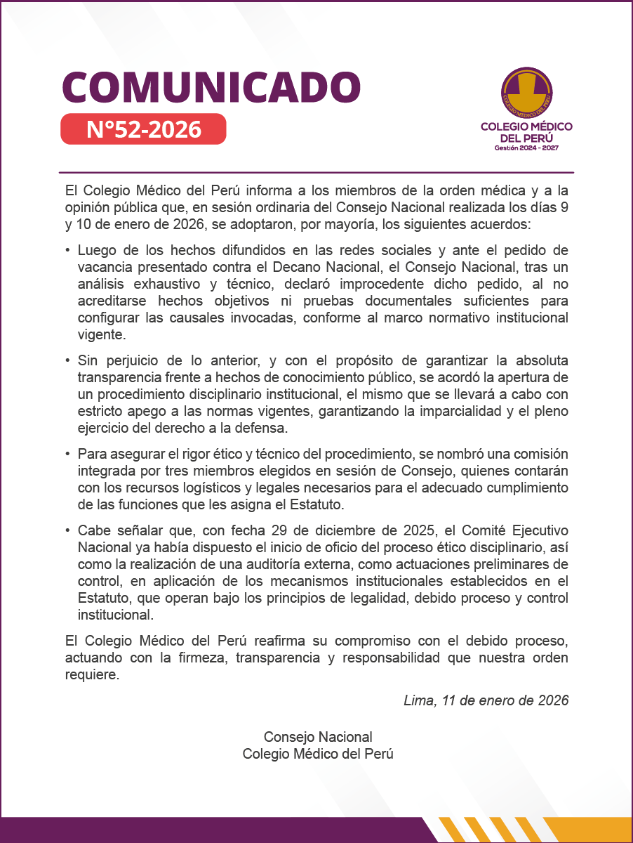 - COMUNICADO N°050/2024 – EEL CONSEJO NACIONAL (CN), MÁXIMA AUTORIDAD DEL COLEGIO MÉDICO DEL PERÚ (CMP), REUNIDO EN LA XIX SESIÓN EXTRAORDINARIA EXPRESA LO SIGUIENTE: