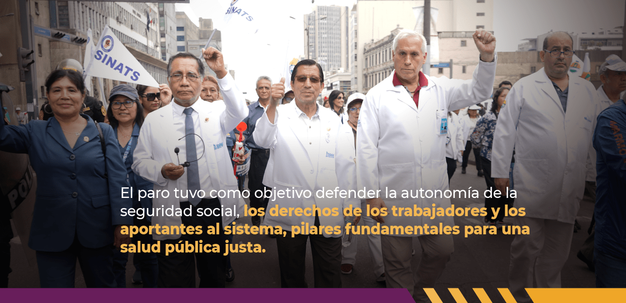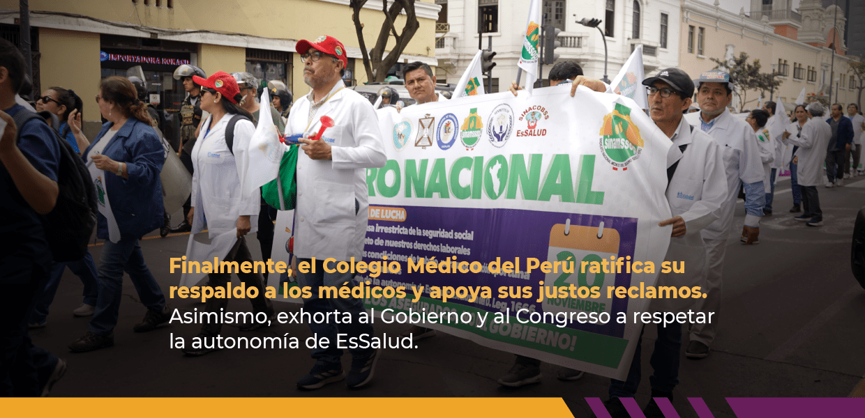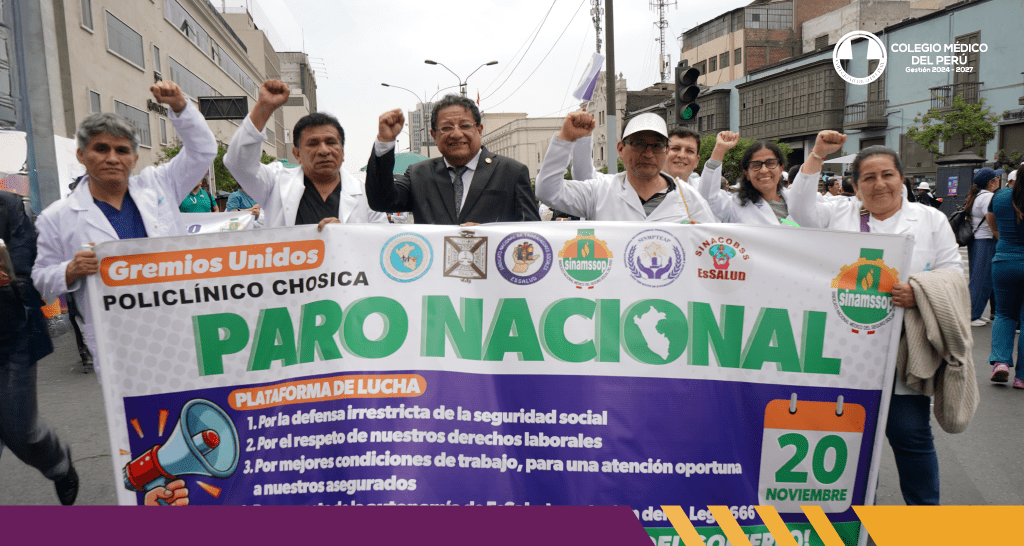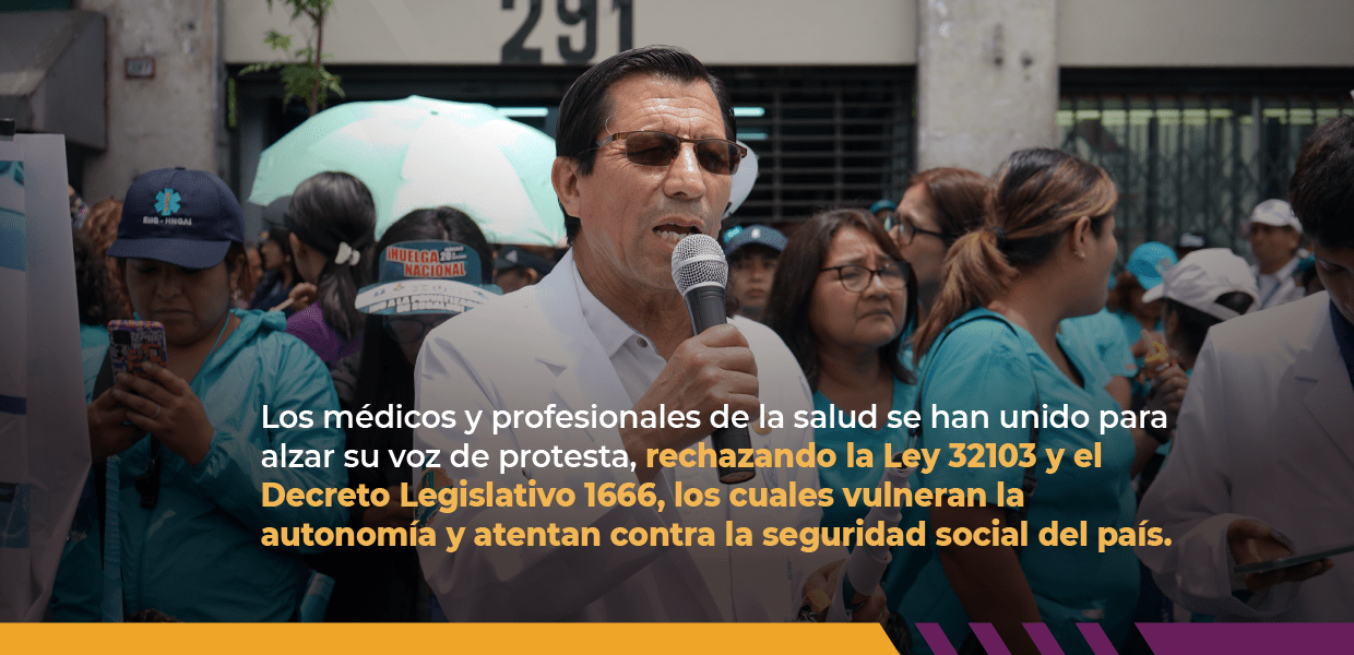 Este 20 de noviembre, el Sindicato de Médicos y Profesionales de la Salud de la Seguridad Social llevó a cabo un paro de 24 horas para rechazar la Ley 32103 y el Decreto Legislativo 1666, los cuales amenazan la autonomía de EsSalud y ponen en riesgo los recursos destinados a la salud.